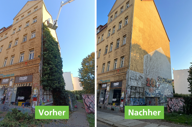 Es gilt: Efeu haftet sehr fest an Wänden. Schließlich muss die Pflanze in der Lage sein, sein enormes Eigengewicht (2.230 kg pro Pflanze, siehe Tabelle in der FLL - Fassadenbegrünungsrichtlinie, 2016) auch im nassen Zustand, bei Eis- und Schneebildung und unter Einfluss von Windlasten bis in 30 m Höhe zu tragen. Eine Entfernung ist entsprechend aufwendig. Die Haftorgane bleiben sichtbar an der Fassade zurück. Sie verursachen keine baulichen Schäden, sind jedoch für manche ein optischer Störfaktor. Eine vollständige Entfernung der Rückstände geht mit einer grundhaften Sanierung der Fassade einher! Es ist also wichtig, sich nur für Efeu zu entscheiden, wenn eine jahrzehntelange Begrünung gewünscht ist.