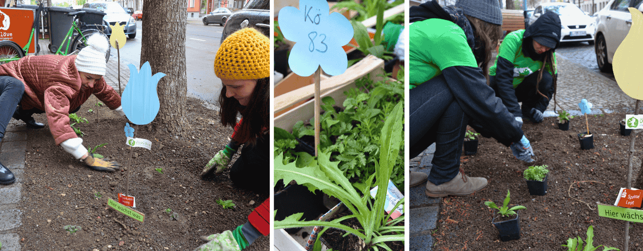 Im November 2018 wurden die ersten Baumscheiben entlang der Könneritzstraße bepflanzt. Bei der gemeinsamen Aktion mit der Sparkasse Leipzig wurden mit Unterstützung engagierter Anwohner:innen 20 Wildstauden und 40 Frühblüherzwiebeln in die Baumbeete gesetzt.