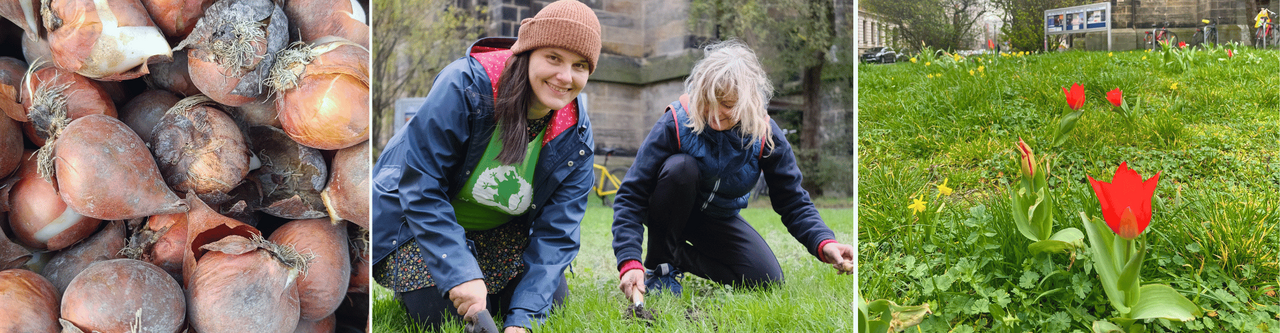 Gemeinsam mit Euch und der engagierten Gemeinde der Leipziger Peterskirche haben wir im Oktober 2023 dreitausend insektenfreundliche Frühblüher in die Rasenflächen zu Fuße der Kirche gesteckt. Wie haben sich die 1.000 Wildtulpen, 1.000 Krokusse und 1.000 Narzissen entwickelt? Rote, gelbe, violette und weiße Blüten bezaubern aktuell, im Frühjahr 2024, als wunderschöne Frühlingsfarbtupfer. Hummeln und andere früh im Jahr fliegende Insekten werden mit Nektar versorgt.