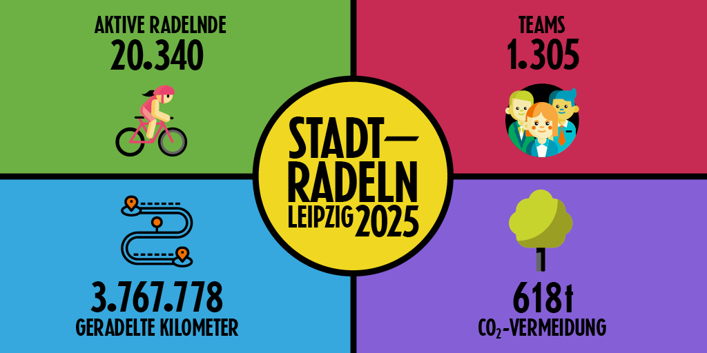 Leipzig hat beim diesjährigen Stadtradeln erfolgreicher denn je abgeschnitten: Vom 29. August bis 18. September radelten mehr als 20.000 Leipzigerinnen und Leipziger über 3,7 Millionen Kilometer – und damit so viele wie noch nie. Damit setzt sich der positive Trend der vergangenen Jahre fort: 2023 beteiligten sich 18.000 Menschen, 2024 bereits 19.000. Durch die diesjährigen Fahrten konnten über 605 Tonnen Kohlenstoffdioxid vermieden werden. Im bundesweiten Wettbewerb landet Leipzig damit auf Platz 5 hinter Berlin, der Region Hannover, Hamburg und München.